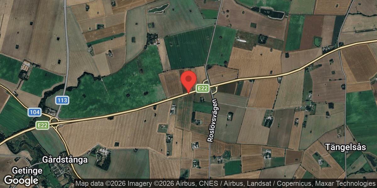 Ett föremål på vägbanan vid trafikplats Roslöv på E22 orsakar liten påverkan på trafiken under förmiddagen den 11 april 2026.